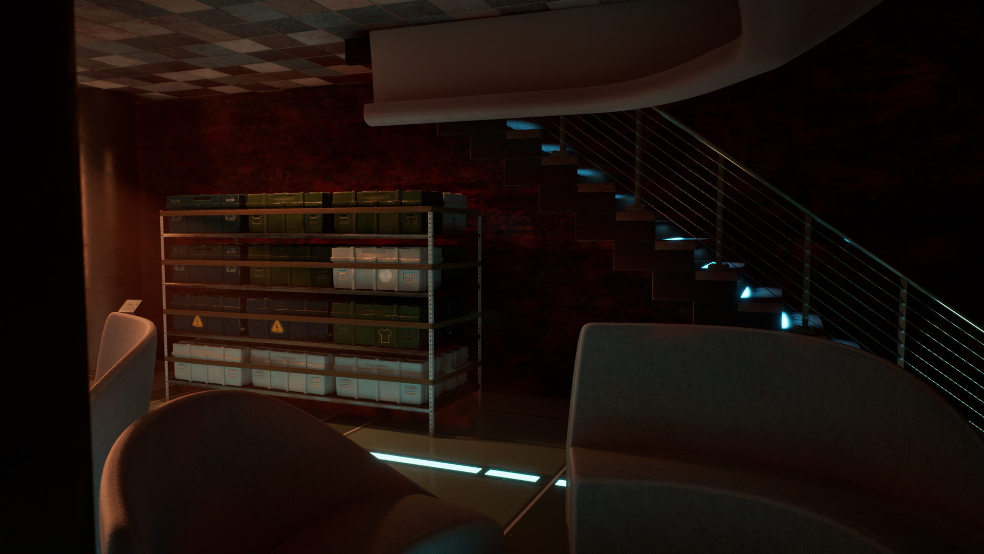Here’s an early process shot of the layout of my scene with most items UV’d. I went very low poly for the floors and walls, choosing to rely on textures to sell the detail. I used blueprints in Unreal to “clone” the wall and floor panels throughout the scene.